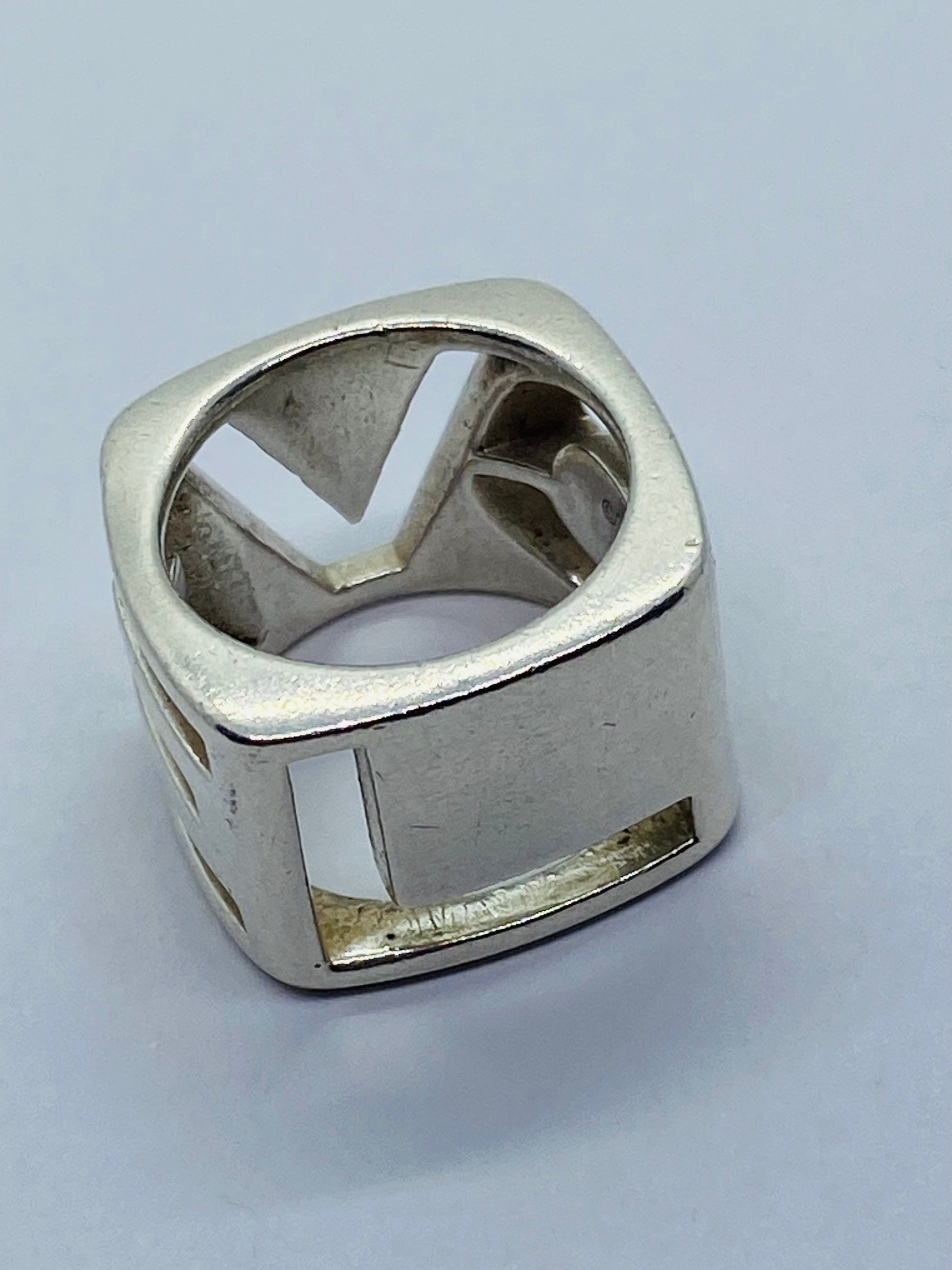 RARE Vintage Tiffany & Co Donald Claflin Stencil Love Ring Sterling Silver - Size sits at 4.75 but it fits smaller than that because of the design - Authentic Box and Bag included - shows some wear scratches but very good overall condition. The letter e seems to be a little bent.